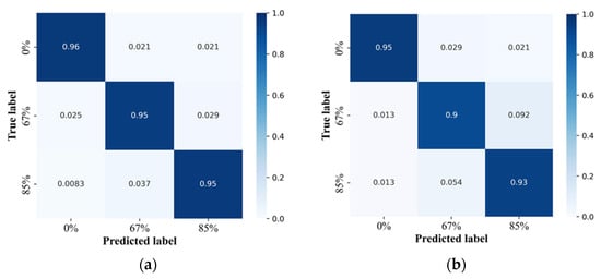 Performance in user attentional focus recognition at different 1RMs: (a) attentional focus recognition without carrying dumbbells; (b) attentional focus recognition lifting weight at 67% of the 1RM; and (c) attentional focus recognition lifting weight at 85% of the 1RM.
