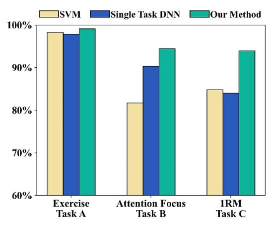 We used a support vector machine (SVM), a deep neural network (DNN) of a single task, and our multi-task and multi-classification network to compare the overall system performance. We found the best hyperparameter of all the models to evaluate the performance of the learning algorithms, and we evaluated the detection performance for each model. For our multitasking and multiclassification network, we used the Adam optimizer with a learning rate of 0.001. For the DNN of a single task, the three branches of the proposed network were trained independently. The 1RM recognition network lost its fusion layer, and other network structures and settings remained unchanged. For SVM, we used RBF as the kernel function and the one-versus-one method to design a multiclassification SVM. The results are shown in Figure 9, which shows that our multitask and multiclassification network method can achieve the highest accuracies in the three recognition tasks. The SVM and DNN of the single task performed well in the exercise recognition task, but did not perform well in the attentional focus and 1RM recognition tasks. As previously mentioned, 1RM recognition depends on specific exercises and attentional focus. An SVM and a single-task network cannot provide such information. Furthermore, we should focus on analyzing the signals obtained during muscle contraction, which has been confirmed with single-task DNN or multitask and multiclassification networks.