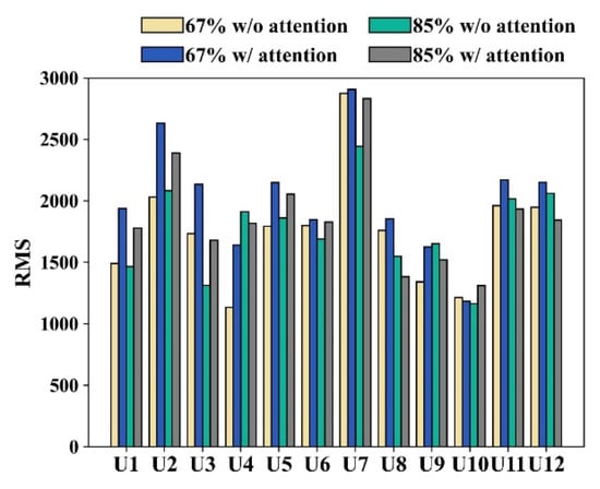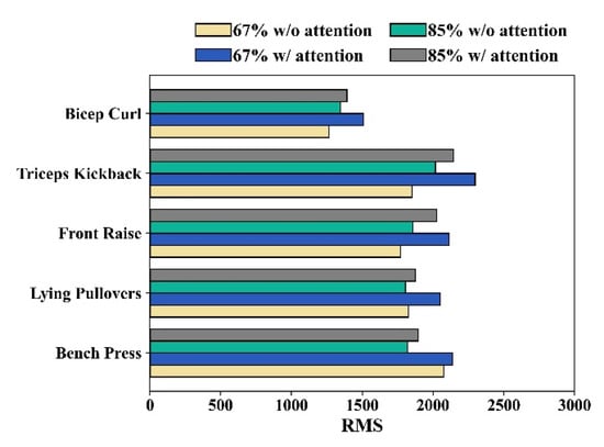 The results in Figure 10 indicate the RMS of each muscle contraction under different conditions of attentional focus and at 67% and 85% of the 1RM, respectively. As mentioned earlier, our objective is exercise effectiveness of muscle strength, which can be achieved by low-intensity exercise according to the ACE’s recommendations of 67% and 85% of the 1RM. We then examined the muscle contraction to provide a detailed examination of the effectiveness of each subject’s exercise. A significant difference was found between exercise with and without attentional focus, which means that exercise with attentional focus has a high impact on muscle contraction at 67% and 85% of the 1RM. The results in Figure 10 also indicate that 10 of the 12 subjects had more muscle contraction during low-intensity weightlifting at 67% of the 1RM, which means that training with attentional focus can affect muscle strength [,,]. This result is also valid for the goal of hypertrophy training, in which adopting attentional focus with lightweight lifting can activate more muscle contraction [,].