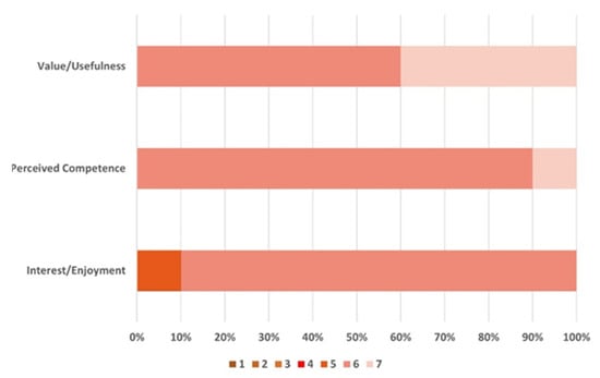 In the IMI, responses are graded on a seven-point Likert scale divided into seven subscales. Three subscales are relevant to our application: interest/enjoyment, perceived competence, and value/usefulness. All questions were randomly assigned to categories and averaged for statistical analysis. Figure 12 summarizes the responses to the IMI questionnaire. Participants were satisfied with the value/usefulness (M = 6.50, SD = 0.58), and four participants (40%) expressed significant agreement. Furthermore, most participants showed a positive response to perceived system competence (M = 6.08, SD = 0.61) and interest/enjoyment (M = 5.87, SD = 0.70). Following the feedback from the questionnaire, we conducted an in-depth interview. We questioned the subjects about their experiences with the system and the new information they gained.