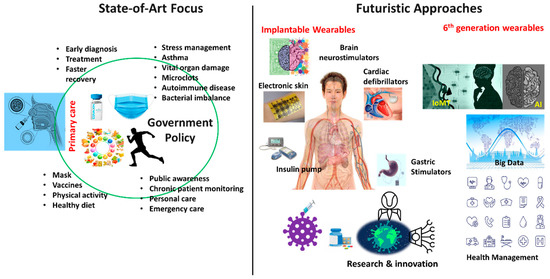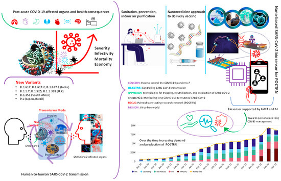 Therefore, COVID-19 and long COVID management require immediate attention from the government [26] (Figure 1). Regular diagnostic monitoring will be effective way for early detection, real-time monitoring of long COVID effects [27]. However, this is a huge task for the medical healthcare system to implement frequent monitoring for individuals due to lack of accessibility and limited available sources. Therefore, self-reporting of the symptoms and everyday monitoring could be a better way for long COVID management to track individual health parameters [28,29]. Hence, we urgently need portable, simple tracking systems to observe vital body parameters in regular intervals for long-sighted COVID management [30]. The common initial physiological signals for COVID-19 patients that are found to be an anomaly, such as respiration rate, variance in oxygen level, cough, heart rate variability, sleeping pattern, and raised body temperature [30]. Therefore, measuring or tracking the above-mentioned vital signs of human body can be designed to develop non-invasive predictive diagnostic technology for any disease detection including viral infections. These portable diagnostics tools including biosensors, microfluidic chips, digital patches, etc., can be used to track human vital parameters in real time [31,32,33,34,35,36].