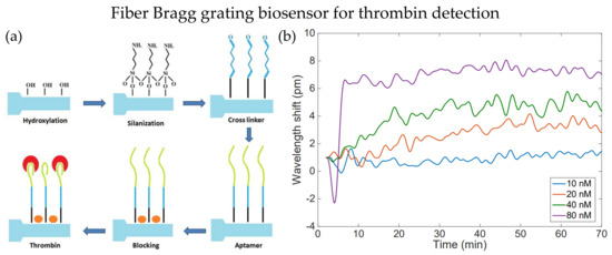 (a) Process of sensor probe preparation for thrombin detection. (b) Wavelength shift for detection of thrombin with different concentrations using EFBG, the results are observed for 70 min. Adapted with permission from Ref. [33]. Copyright 2018, MDPI.