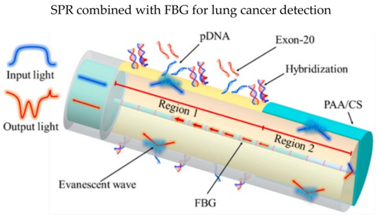 Besides, Li et al. demonstrated an SPR biosensor that can detect three parameters simultaneously in a single fiber: epidermal growth factor receptor (EGFR) gene, temperature, and temperature [81]. Optical fiber biosensors are vulnerable to temperature and pH. Two SPR in an FBG was designed in the sensor probe, as illustrated in Figure 6, and the FBG was coated with 35 nm gold film before functionalization. Probe DNA sequences (pDNA) were immobilized in region 1 to detect exon-20, while PAA/CS was coated in region 2 using LbL technique for monitoring pH values. They reported a low LOD of the EGFR gene of 13.5 nM and a sensitivity of 0.04 nm/nM when detecting exon-20. The multi-parameter optical fiber biosensor has fulfilled the needs for clinical analysis where temperature and pH values affect the sensing accuracies.