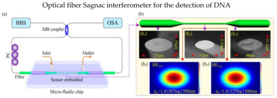 Specialty fibers are often deployed in the SI to increase sensitivity and biocompatibility. In 2017, Gao et al. presented a SI DNA biosensor using high birefringence elliptical microfiber as a sensing point, as shown in Figure 7a, and the waist of microfiber is only 5.2 μm [84]. Profile images of the sensor are shown in Figure 7b; the microfiber was spliced with SMF on both ends. The detection limit for the target ssDNA concentration is 75 pM. Another optical DNA sensor was proposed in 2018 by Song et al. [85]. The sensor is based on a microfluidic system within the SI. The sensing fiber is a modified side-hole fiber corroded by hydrofluoric acid. The experiment results showed a shift in wavelengths of 38.142 nm after 20 min. In 2018, Li et al. utilized the exposed core microstructure optical fiber to detect streptavidin biomolecules. Biotin was immobilized in the fiber core to capture the streptavidin biomolecules. The proposed fiber has noncircular symmetry and could access to the evanescent field directly. Moreover, it has a high RI sensitivity of −3137 nm/RIU [8].