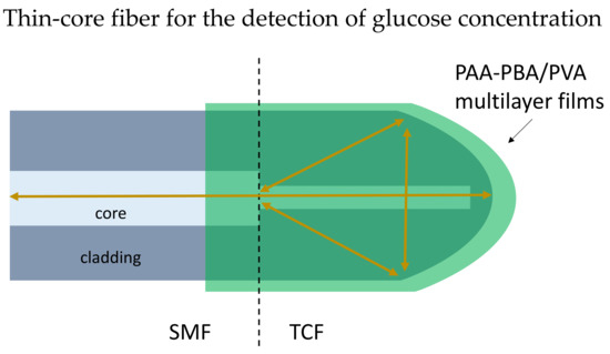 Michelson Interferometer (MI) based biosensor has a reflecting surface at the sensor probe ends. The performance of MI fiber is observed through the reflection spectrum [90]. The MI formed when the two reflected light beams from two arms recombined in the coupler. The compact design of the MI structure biosensor contains a sensor probe that can easily be placed into a measurand solution for point measurements. In 2019, Wang et al. presented a reflection-based biosensor to detect glucose using a thin-core optical fiber [91]. The thin-core fiber tip was modified into a rounded shaped as the reflecting surface, and phenylboronic-acid-derivatized poly (acrylic acid) (PAA-PBA)/poly (vinyl alcohol) (PVA) was coated on the fiber LbL as shown in Figure 9. Experimental results proved the shift of resonance dip is linearly related to the logarithm of glucose concentration in the range of 10 μM–10 mM. The study shows the potential of application in insulin delivery systems.