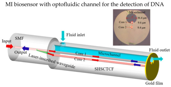 The optofluidic system can incorporate with MI design, which only requires a small amount of detection solution due to the microchannel. In 2016, Gao et al. theoretically and experimentally studied an MI-based fiber optofluidic biosensor using modified PCF to detect DNA hybridization and methylation [93]. A layer of gold film was coated on the tip of the sensor probe as the reflective surface. Part of the PCF was intentionally fused to collapse for the microchannel, and the microchannel for optofluidic was fabricated using femtosecond laser micromachining. The microchannel was coated with a layer of PLL first, then ssDNA was immobilized on the PLL layer. The LOM reported is 5 nM. In 2022, Hu et al. demonstrated an optofluidic MI biosensor that has LOD of 1 μM in detecting specify DNA solution, and only a small volume of test solution (tens of nL) is required [94]. The sensor probe of single hole suspended core twin-core fiber (SHSCTCF) end was coated with 100 nm thick gold film, and one of the cores was exposed to the microchannel, making it direct contact with air/test solution as shown in Figure 10. Core 1 was silanized with APTES and immobilized the carboxylated ssDNA on core 1. Moreover, the sensor has a high RI sensitivity of 1039.77 nm/RIU, and the LOD was 1.675 × 10−5 RIU.