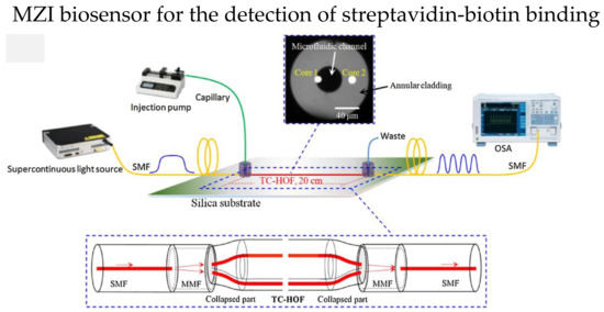 The two independent cores in TCF could be utilized in MZI, one of the cores as the reference arm, while the other is modified as the sensing arm. In 2018, Yang et al. reported an MZI-based streptavidin-biotin binding sensor using a TCF [97]. The TCF ends were spliced with a short multimode fiber, then spliced with an SMF, as shown in Figure 12. Core 1 in the microfluidic channel is the sensing arm, while core 2 is suspended in the cladding, which serves as the reference arm. First, the microfluidic channel surface was silanized with 3-Mercaptopropyl trimethoxysilane; then, covalent bond technique was used to immobilize thestreptavidin on the sensor surface. The RI sensitivity of 2577 nm/RIU and the sensitivity of 16.9 nm/(mg/mL) in detecting biotin with a LOD of 3 μg/mL were reported.