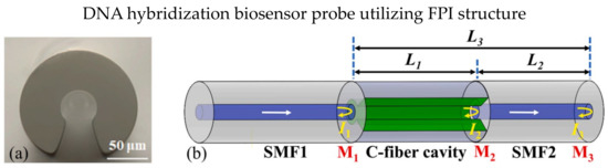 C-type fiber is frequently used in optical fiber FPI biosensor applications due to the special fiber design of C-shape, which allows analytes to fill in the fiber as a microfluidic channel, as shown in Figure 13a [106,107]. In 2019, Xie et al. presented an FPI-based biosensor using cascaded C-type fiber [106]. The two C-type fibers showed good multiplexing capability with minimal crosstalk. The biotin-streptavidin binding mechanism utilized the sensor cavity. They reported that the cascaded C-type fiber reduced the false positive measurements significantly. In 2020, Li et al. demonstrated a quantitative polymerase chain reaction (qPCR) using an all-optical system using C-type fiber [107]. The FPI cavity is constructed using C-type fiber to monitor the temperature in real time, and the biosensor is highly sensitive to fluorescence during the qPCR process. The design was improved in 2022; Li et al. proposed a DNA hybridization biosensor probe using C-type fiber with the Vernier effect [108]. The fiber structure is SMF-C-type-SMF, in which C-type fiber act as an FPI cavity, as shown in Figure 13b. The Vernier effect in the FPI cavity occurred in the cavity’s solid and air parts, exhibiting a RI sensitivity of 10,791.12 nm/RIU. The biosensor probe was functionalized by APTES and immobilizing of pDNA on the SMF surface, and the LOD was 1 μM complementary DNA. The direct interaction of analytes and fiber in C-type fiber exhibits high RI sensitivity. Still, the optical loss is expected to be increased due to the involvement of liquid analytes in the optical path.