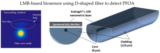 D-shape fiber has a polished flat surface, as shown in Figure 14, which could be fully utilized to coat a thin film layer. In 2021, Moro et al. proposed an LMR-based D-type SMF coated with a thin-film layer of tin dioxide (SnO2) for the detection of perfluorooctanoic acid (PFOA), as illustrated in Figure 14 [121]. SnO2 thin-film significantly enhances the RI sensitivity of LMR-based optical fiber sensors [122]. Delipidated human serum albumin (hSA) was covalently immobilized on the tin dioxide thin film to recognize the PFOA in a test analyte. They reported the LMR wavelength shift due to the hSA/PFOA interaction could be modeled using the Langmuir adsorption isotherm.
