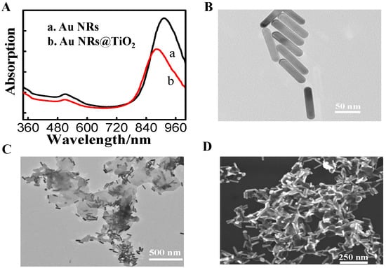 (A) UV−Vis spectra of Au NRs and Au NRs@TiO2 nanostructures; (B,C) were TEM images of Au NRs and Au NRs@TiO2, respectively. (D) Scanning electronic microscopy (SEM) image of Au NRs@TiO2.