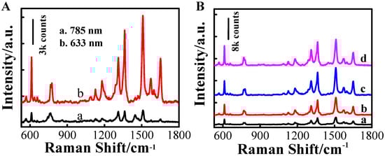 (A) The comparison of Raman signals collected under different laser light sources with wavelengths of 785 nm and 633 nm, respectively; (B) SERS spectra of 0.10 μM R6G on Au NRs@TiO2 SERS substrates with different amounts of Au NRs@TiO2. The dilution factors of Au NRs@TiO2 in a–d were 32 (a), 16 (b), 12 (c), 4 (d) times, respectively, as compared with the synthesized Au NRs@TiO2 solution.