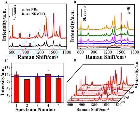 To test the reproducibility of substrate to substrate, the SERS signals of R6G at 1510 cm−1 from five parallel-prepared Au NRs@TiO2 substrates were collected and analyzed, for which the relative standard deviation (RSD) of Raman intensity was calculated to be 9.1% (Figure 3C). The Au NRs@TiO2 substrates can be recycled through ultraviolet (UV) irradiation, followed by immersing the substrates into CTAB aqueous solution to remove residue.