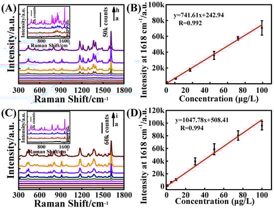 We have demonstrated that the Au NRs@TiO2 substrate showed excellent SERS activity and can be recycled by UV irradiation. The proposed SERS platform was employed for detecting MG and CV in a liquid sample. The characteristic peak of MG at 1618 cm−1 (the stretching vibrations of ring C–C) [41] was used as the quantitative peak. The result is shown in Figure 4A,B, where the proposed Au NRs@TiO2 substrate can be used to detect the MG quantitatively from 0.75 to 100.0 μg/L, and the lowest detectable concentration of MG in water was 0.75 μg/L. In addition, the corresponding regression equation was y = 741.61x + 242.94 (R = 0.992). In addition, the CV can also be detected by using the proposed SERS substrate. As observed in Figure 4C, the characteristic peak of CV of 1618 cm−1 (the stretching vibration of the ring C–C) [42] can be clearly recognized even when the concentration of CV was only 0.50 μg/L. The plot in Figure 4D depicts a linear relationship between peak intensities and CV concentrations, which ranges from 0.50 to 100.0 μg/L (y = 1047.78x + 508.41, R = 0.994).