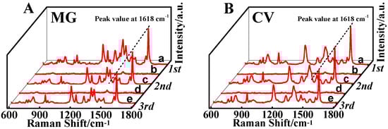 Next, 10.0 μg/L MG and 5.0 μg/L CV adsorbed on Au NRs@TiO2 substrates were investigated under UV irradiation. As can be seen in Figure 5A,B, the SERS signals of MG and CV disappeared after UV irradiation for 90 min. When the substrates adsorbed MG and CV again, the SERS signals of MG and CV appeared again, and the substrate still maintained a high SERS enhancement effect. It has been experimentally confirmed that the SERS substrates can be used to detect MG and CV, and can be recycled three times.