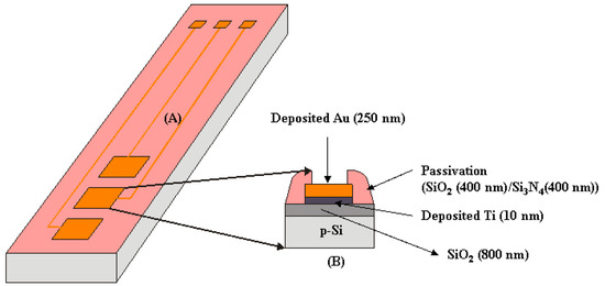 The microelectronics fabrication process for the microelectrodes was performed at Centro Nacional de Microelectronica (CNM). The process started with a thermal oxidation process to grow a thick oxide layer (8000 Å) on 100 mm diameter P-type <100> silicon wafers with a nominal thickness of 525 mm. The working microelectrode was made with a metal layer consisting of a thin titanium film (10 nm) promoting gold adhesion plus 250 nm of gold. After that, photoresist layer was spin-coated with a spinning speed of 3000 rpm and was exposed in UV light with a pattern mask. Etching away the exposed photoresist was performed with the developer OPD4262 from Fujifilm. The remaining photoresist corresponded exactly to the microelectrodes, and then the gold, unprotected by the photoresist, was etched away. The next step consisted of the deposition of two PECVD (Plasma-Enhanced Chemical Vapor Deposition) layers of SiO2 (4000 Å) and Si3N4 (4000 Å), to act as a passivation layer. The second photolithographic process was performed to open the passivation on the active Au microelectrodes (300 µm × 300 µm; area: 9 · 10−4 cm2) and on the soldering pads. The structure of the microelectrodes is shown schematically in Figure 3. Wire bonding was performed using a Kulicke & Soffa 4523 A Digital instrument from Kulicke & Soffa, Singapore.