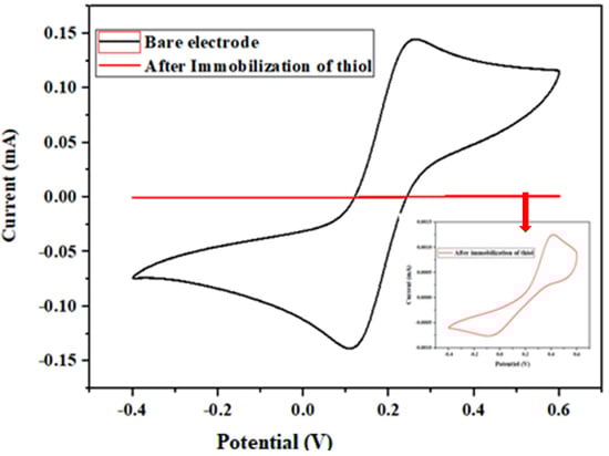 The gold electrodes were characterized by cyclic voltammetry (CV) before and after the immobilization of the amino thiol. The CV scan was carried out from −0.4 to +0.6 V, with a scanning rate of 80 mV/s in 5 mL of PBS in the presence of the redox couple [Fe(CN)6]3−/4−. Figure 3 shows that the oxido/reduction peaks of bare gold disappear after the immobilization of aminothiol. The disappearance of the oxido/reduction peaks was caused by the blocking of the aminothiol layer of the gold surface, thus creating a low electron transfer rate.