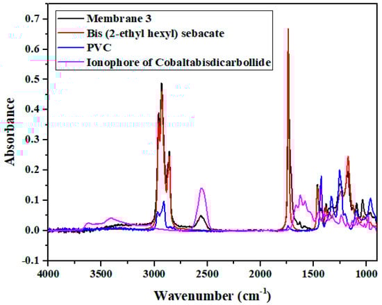 FTIR spectra of the different compounds of our membrane: bis (2-ethylhexyl) sebecate (plasticizer) (Figure S6), PVC polymer matrix (Figure S7), and ionophore of cobalt bis(dicarbollide) (Figure S8) were superimposed with the FTIR spectrum of membrane 3 after deposition onto the microelectrode (Figure 6).