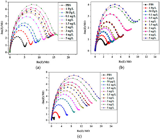 Nyquist diagrams of gold electrode/membrane interface (membrane 1, 2, 3) for different concentrations of tetracycline from 1 pg/L to 5 ng/L in a frequency range between 100 kHz and 6 Hz by applying a potential of −0.4 V and amplitude potential of 10 mV. (a) membrane 1; (b) membrane 2; (c) membrane 3.