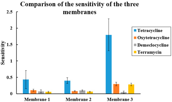The slope of each curve of the three membranes for the detection of tetracycline, oxytetracycline, demeclocycline, and terramycin are drawn as bars in Figure 8. The sensitivity of detection of tetracycline was 5 times higher than that of oxytetracycline and of terramycin, and 22 times higher than that of demeclocycline.