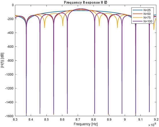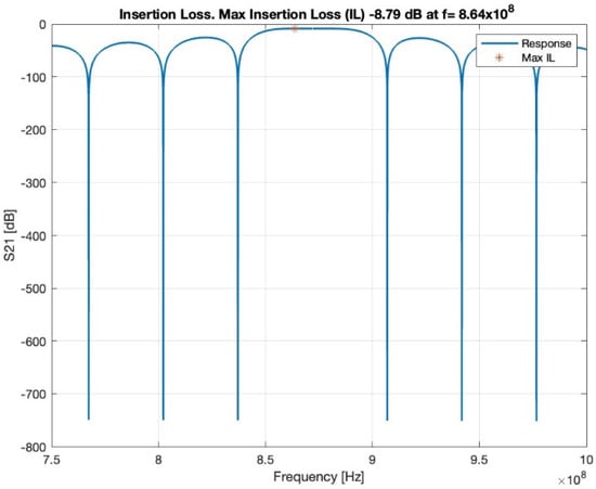 In the first-order model, the insertion loss achieved a loss of −8.79 dB at 864 MHz, as shown in Figure 4. The loss value is related to the operating frequency.