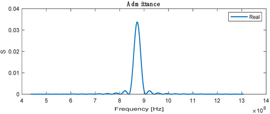 The admittance is the sum or superposition of the conductance and susceptance, defined as the ratio of the input current to voltage, and the highest admittance is recorded at a resonance frequency with a value of 0.032 , as shown in Figure 5.