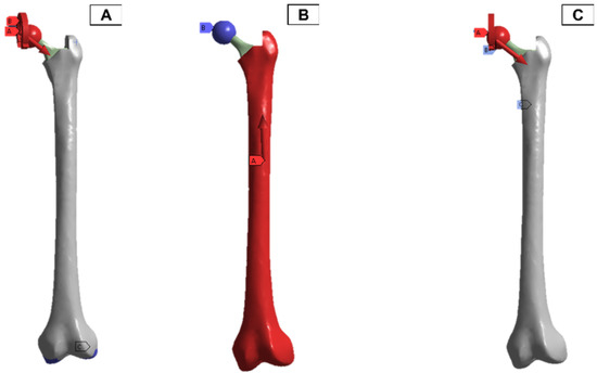 In the finite element model setup, a mesh sizing of 2.7 mm was adopted, and the output was realised for a convergence in the stress variables for the static loading conditions. The loading and boundary conditions adopted were based on in-vitro studies in the literature. As a result, there are different force directions and magnitudes due to the upper- and lower-body loading. These are shown in Figure 11, where A and C have the force and moment applied from the hip joint, and B has the force applied from the lower body.