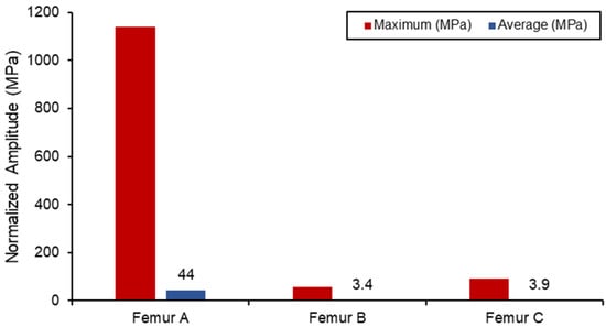 The static simulation of the different loadings was run, with the average and maximum stress values shown in Figure 12. All the results with the femur were within proximity to values found in the literature for similar loading conditions, with differences observed only due to different geometries. Due to the relatively small boundary fixture, femur (A) experienced the largest stress concentration as the bone acted like a cantilever setup. As a result, SAW sensor simulation readings would be skewed due to the larger bending deformation. The femur (B) has the lowest stress concentration in comparison also due to the lower loading conditions from the lower body. Both femur (B) and femur (C) loading do not exceed the yield tensile or compression strengths of the bone material used [47,48].