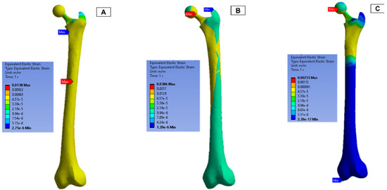 The strain measurements of the femur are shown in Figure 13. In both femur (B) and (C), the upper half of the femur experienced a higher strain concentration, and the maximum concentration was around the ball joint.