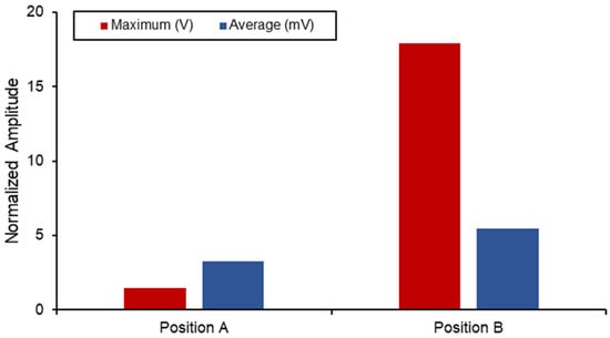 Figure 15 displays a comparison between the different voltage output out of the SAW sensors when subjected to the combined static load at the ball joint. Position B naturally has a higher output and experienced strain due to its proximity to the fixed boundary. However, when comparing the differences in the average measurements between the two, a 40% increase was seen in position B. The voltage output produced by the implants in this position is higher than the values reported in the literature, and the results are shown in Table 6. However, this degree of sensitivity and proximity to the fixed joint can introduce noise and interference with the electromechanical properties of the sensor as well as the acoustics. Therefore, additional work on the vibro-acoustics of wave propagation with the involvement of dynamic loading would address the applications of long-term monitoring implant systems.