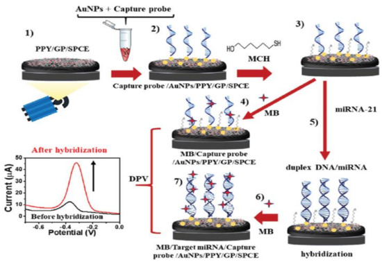 Many studies have reported that graphene can be used as a biosensor material for detecting BC biomarkers. For example, Pothipor et al. [75] designed a biosensor using graphene, polypyrrole (PPY), and gold (AuNPs) for the diagnosis of miRNA-21. The modification of a carbon electrode (SPCE), and the preparation of the biosensor are revealed schematically in Figure 3. Both the surface and conductivity of the electrode were shown to be boosted by graphene. Furthermore, the addition of PPY was shown to grow the effective surface of the electrode, and to improve the dispersibility of the AuNPs on the surface. This is advantageous because AuNPs can enhance the immobilization of DNA probes due to their good biocompatibility and high dispersibility. AuNPs, as a kind of inorganic nanoparticle, have gradually been recognized as promising nanomaterials due to their unique optical, electronic, sensing, and biochemical properties. As a result of their unique properties, AuNPs have found wide application in biomedical fields including diagnosis, biosensing, and drug delivery [86]. AuNPs can also increase electron movement in biosensors due to their high conductivity. As a result, the biosensor exhibited LR values in the range of 1 fM to 1 nM, and an LOD of 0.02 fM.