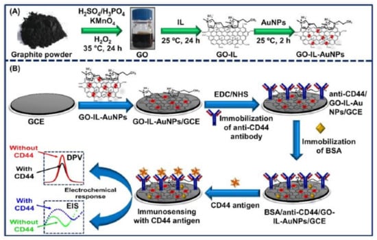 The differentiation-44 (CD44) antigen is a transmembrane glycoprotein found on cell surfaces [127]. Several studies have shown that CD44 is expressed on the surface of cancer stem cells, which may contribute to cancer beginning and development. Numerous cancers are associated with high CD44 concentrations, including breast, prostate, lung, colon, etc. [128,129]. Moreover, CD44 has been found to exhibit metastatic cancerous behavior in clinical studies, thereby suggesting that it can serve as a BC biomarker. Therefore, the CD44 antigen could serve as a key early-stage biomarker for investigating BC growth [130,131]. Hence, Ranjan et al. [114] used a nanocomposite of GO, Au NPs, and an ionic liquid (IL) to develop a biosensor for CD44 detection, as shown schematically in Figure 5. ILs possess excellent physical, chemical, and electrochemical properties, such as high conductivity, a wide electrochemical window, low volatility, high stability, high stabilization power, and strong adhesive properties. Furthermore, they possess excellent biocompatibility and stabilizing properties for biomolecules [132,133]. Numerous studies suggest that the combination of ILs and GO produces better material than either ILs or GOs alone [134,135]. The GO was shown to facilitate the immobilization of antibodies due to its oxygen-containing functionalities, while the AuNPs enhanced the performance of the biosensors by facilitating charge transfer and growing the effective surface area. The LR of the resulting CD44 biosensor ranged from 5 fg mL−1 to 50 μg mL−1, with LOD = 2 fg mL−1.