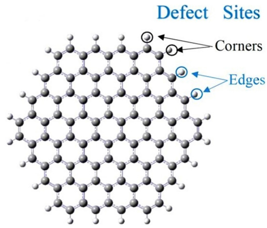 Quantum dots (QDs) are inorganic semiconductors with unique optical and electronic properties, and have generated significant interest over the past two decades [174,175]. In particular, GQDs are small graphene fragments in which electronic transport can occur in three spatial dimensions [176]. The chemical building of the GQD is exposed in Figure 8. The special edge and quantum confinement effects of the GQDs distinguish them from other carbon materials such as CNTs, carbon QDs, and graphene [177,178]. The GQDs usually have a size range of below 20 nm and excellent chemical, physical, and biological properties [179,180]. The small size of GQD makes it a better candidate for biomedical applications than graphene and graphene oxide [181]. GQDs are used in numerous applications, including drug delivery systems, bioimaging, and biosensors [180,182,183]. GQD-based electrochemical biosensors have gained considerable attention in recent years for the detection of various analytes. A summary of GQD-based biosensors for the diagnosis of BC is provided in Table 4.