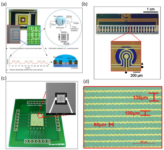 The silicon-based impedance biosensors. (a) A low-cost 0.35 mm CMOS technology by TSMC (Taiwan) was used to fabricate the micro-array chip that sensed DNA characterization. Reproduced with permission from [27]. Copyright Scientific Reports 2013. (b) Integrated surface plasmon resonance and electrochemical impedance spectroscopy in a microfluidic chip [30]. Reproduced with permission from [30]. Copyright Sensors and Actuators B: Chemical 2017. (c) Silicon substrates were microfabricated to create microgrooves. Reproduced with permission from [32]. Copyright Microsystems and Nanoengineering 2020. (d) A biosensor combining impedance and photoelectrochemical was designed. Reproduced with permission from [33]. Copyright Biosensors 2022.