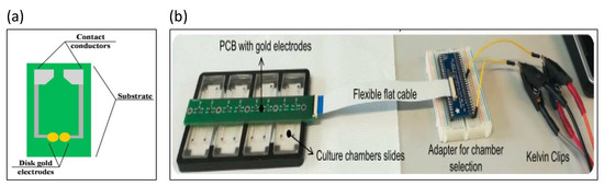 The PCB-based impedance biosensors. (a) Gold electrodes were printed on commercial printed circuit boards. Reproduced with permission from [35]. Copyright Scientific Reports 2013. (b) An electrical impedance sensor was used to detect the degree of fibrosis in liver tissue. Reproduced with permission from [37]. Copyright Biosensors 2022.