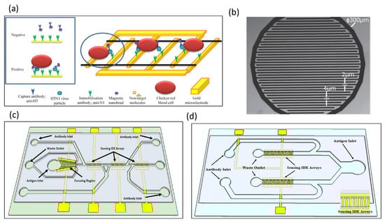 Pathogenic avian influenza viruses have been detected by impedance sensors [112]. The polyclonal antibody was immobilized on the surface of a gold microelectrode by protein A. The antibody–antigen binding reaction in the same research could be amplified by red blood cells, and the proposed impedance immunosensor could be completed in as little as 2 h. A portable impedance biosensor for avian influenza virus H5N2 was developed by Wang et al. [113]. Magnetic nanobeads and interdigitated array microelectrodes were integrated on a microfluidic chip, where the magnetic nanobeads captured avian influenza virus subtype-specific antibodies. The entire detection time was less than 1 h, which was greatly reduced compared with traditional avian influenza virus detection. The experimental results indicate that the sensitivity of the impedance biosensor is comparable to that of real-time reverse transcriptase PCR. Jacob Lum designed an impedance biosensor, mainly for avian influenza virus subtype H5N1 [55]. For this purpose, immunomagnetic nanoparticles and interdigitated microelectrodes were designed on a microfluidic chip. The polyclonal antibody was immobilized on the surface of the microelectrode, which binds to avian influenza virus H5N1 to generate an impedance signal. Chicken red blood cells were used as biomarkers attached to interdigital microelectrodes. The results showed that the impedance signal can be increased by more than 100%. For the detection of human immunodeficiency virus, Shafiee et al. designed a microfluidic sensing chip to measure the impedance spectrum of virus nanolysates [114]. Two gold electrodes were designed on both sides of the microchannel cavity. The lysis of the virus results in the release of the ions and charged molecules of the virus into a non-ionic solution. That research demonstrated that impedance spectroscopy provides a convenient and rapid tool for the detection of multiple pathogens. Singh et al. developed an electrical impedance sensing chip to detect influenza H1N1 virus, as shown in Figure 8a [115,116], for which three microelectrodes were fabricated on a glass substrate. The authors used reduced graphene oxide and monoclonal antibodies as electrode modifications.