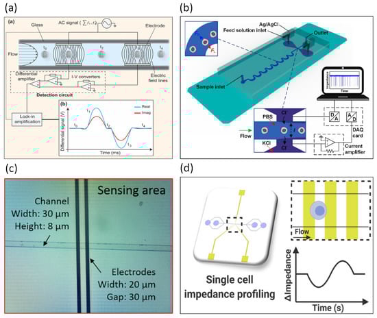 David et al. used impedance flow cytometry to measure the viability and membrane potential of Bacillus megaterium cells [99]. A microfluidic impedance cytometer was designed for platelet analysis by Evander et al. [100], where the focusing electrodes allow for secondary focusing of the sample through the dielectrophoretic force. Lin et al. used a microfluidic impedance cytometer to detect quantified protein biomarkers [101]. For whole blood analysis, Simon et al. developed a microfabricated AC impedance cytometer with multi-frequency AC impedance and side scatter analysis capabilities [102]. Xie et al. proposed the concept of using a microfabricated impedance cytometer to detect electronic biomarkers [103]. By changing the dielectric properties of the particle, the authors designed a nanoelectronic barcode particle as an electronic biomarker. McGrath et al. used a microfluidic impedance flow cytometer to distinguish the oocysts of protozoan parasites, as shown in Figure 7a [104]. This chip can distinguish between Cryptosporidium parvum, Cryptosporidium muris, and Giardia lamblia within minutes. A microfluidic impedance cytometer integrating inertial focusing and liquid electrodes was developed for the high-throughput measurement of human breast tumor cells and leukocytes, as shown in Figure 7b [105]. The purpose of inertial focusing is to reduce cell adhesion and ensure that single cells pass through the sensing area. An interesting study involved the use of two microneedles, placed on either side of a microchannel to sense impedance values [106]. For clinical analysis and judgment, Sun et al. used multi-frequency impedance spectroscopy and machine learning to rapidly distinguish the survival of cancer cells under the action of anti-matriptase-conjugated drugs [107]. Sui et al. developed an impedance flow cytometer to detect spheroid green algae cells (Picochlorum SE3) at different salt concentrations, as shown in Figure 7c [108]. Mahesh et al. published a study on the observed “double-peak” characteristics of individual cells with high sensitivity to changes in cell membrane capacitance [109]. This phenomenon has limitations: it operates at the lower frequencies (400–800 kHz) of the beta-dispersion mechanism, and the microelectrodes must be coplanar and paired. The authors pointed out that changes in cell size and membrane capacitance can be resolved using a single frequency. A microfluidic impedance cytometer was used for the analysis of antigen-specific T lymphocytes, as shown in Figure 7d [110]. The experimental results demonstrated that differences in impedance can be observed among dead, healthy, and activated lymphocytes. Caselli et al. used artificial intelligence methods to decipher signals from microfluidic impedance cytometers [111]. The authors demonstrated two advances: (i) the use of a neural network to determine the dielectric properties of single cells in raw impedance data streams and (ii) resolving the impedance signatures of coincident cells. The results demonstrated that the neural network could increase the signal processing capability of the microfluidic impedance cytometer.