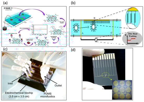 Berdat et al. used an impedance sensor based on an interdigitated microelectrode array to sense DNA [116], for which 5 µm wide microelectrodes were fabricated using a lift-off process method. The complementary probe was first immobilized on the electrode and hybridized to the target ssDNA. Finally, impedance sensors were used to detect the pathogen Salmonella choleraesuis in dairy products. Javanmard et al. developed a set of impedance sensors for DNA hybridization, as shown in Figure 8b [117]. Oligonucleotide probes were immobilized on the surface of the microchannel, and target DNA strands were immobilized on the surface of polystyrene beads. Contact between the probe and the target DNA strand results in the hybridization of the DNA, leading to the capture of the polystyrene beads on the surface of the microchannel. An impedance chip for sensing DNA hybridization was developed by Hadar et al., as shown in Figure 8c [118]. Single-stranded DNA probes were functionalized onto electrodes, and complementary DNA hybridization was then induced using electrochemical impedance spectroscopy. DC-biased AC electro-osmotic vortex was utilized to design a label-free electrochemical impedance spectroscopy (EIS)-based DNA biosensing chip [119]. Based on the electro-osmotic vortex, 20-base target DNA fragments were hybridized to achieve 90% within 141 s. The ultrasensitive detection limit was 0.5 aM. Another study indicated that the electric field was manipulated by alternating current (AC) electrokinetics to improve hybridization efficiency and reduce hybridization time [120]. Thus, the chip was realized for faster and more efficient detection.