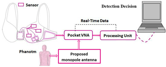 Recently, microwave imaging and detection systems offered a great alternative in terms of resolution, safety, pain-free, as well as low cost and less scanning time. Sensing using microwaves mainly relies on detecting differences in electrical properties between normal and cancerous tissues in the breasts [11,12,13,14,15,16,17,18,19,20,21,22,23,24,25,26,27,28,29,30,31]. Several studies reported a significant contrast in the range of 1:2.3 to 1:10 between dielectric properties of healthy and cancerous breast tissues [21,24,25,26,31]. Thus, the idea of developing wearable detection systems using microwaves is more eminent and will be capable of detecting tissues with breast cancer [21,24,25,26,31]. One of the most important elements in the microwave detection system is the antenna used to transmit/or receive electromagnetic energy. Many antennas have been designed for breast cancer detection, such as horn antenna [12], CPW antenna [13], 3D antenna [14], microstrip antenna [15], dielectric resonator antenna (DRA) [16], and monopole antenna. Thus, developing textile-based antennas as wearable antenna sensors is emerging in the literature [17,18,19,20,21,22,23]. Many textile-based antennas are reported in the literature for various applications and specifically developed by our group in [24,25]. This study was conducted towards developing wearable microwave imaging systems for breast cancer detection and monitoring as shown in Figure 1.