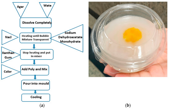Many types of mixtures are reported in the literature to replicate breast and tumor phantoms [39,40,41,42]. In the proposed work, as shown in Figure 3a, the recipe reported in [43] was adopted in the fabrication of both the breast and tumor models. For the breast models, 4.5 g of agar is dissolved in 50 mL of distilled water, 150 mL corn oil, and 30 mL neutral detergent. Next, sodium chloride and sodium ethate monohydrate are added to the mixture. After the solution is dissolved, it is heated up to 80 °C until bubbles begin to form, and the mixture becomes transparent. At that stage, the heat is turned off and xanthan gum is added to the solution and mixed. Finally, polyethylene powder is added to obtain a homogeneous mixture. The mixture is poured into a mold suitable for the anatomical structure. On the other hand, the tumor model is prepared in the same way but with different proportions of 100 mL deionized tri-distilled water, 60 mL ethanol, 1 g NaCl, and 1.5 g agarose [43]. For all materials used, a little yellow color is used to distinguish the tumor model as shown in Figure 3b. All models were kept in the refrigerator to solidify. Figure 3a presents the flow chart of the fabrication of the breast and tumor models as well as the fabricated breast model with tumor inserted in the middle.