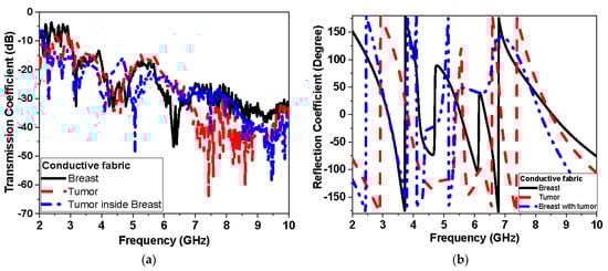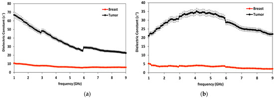 Furthermore, breast and tumor phantoms have been fabricated and characterized using DAK-3.5-TL2 (dielectric probe station) in the range of 1–9 GHz. Figure 4 shows that there are distinguished differences in electrical properties between the breast and the tumor models over the operating band extended from 1 GHz to 9 GHz. The average real part of the breast phantom ε′r is about 7, while the tumor ε′r is about 55. Moreover, the imaginary part of the breast phantom and tumor ε″r is about 4 and 27, respectively. This validates sensing tumor tissue inside the breast with measured contrast ratio 1:8. The proposed sensors have been placed on fabricated phantoms and measured using a vector network analyzer (VNA). Variations have been recorded in both reflection (S11) and transmission (S21) as shown in Figure 18, Figure 19 and Figure 20 when tumor phantom is inserted inside the breast model.