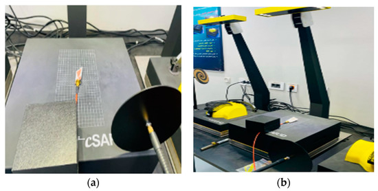 To assess the safety of the wearable antenna-based sensors, specific absorption rate (SAR) is simulated and measured. A flat phantom for body-worn measurements (meets both IEC and FCC criteria for tissue-simulating media) as well as the left and right sides of the SAM head phantom are included in the equipment. Speag Switzerland is used for SAR measurements (cSAR3D) for conducting high-precision SAR measurements of devices operated on the body and both sides of the head as specified by IEC62209-1, IEEE 1528, FCC OET65, etc. cSAR3D performs fast (0.3 s) and repeatable (<0.1 dB) measurements in the band from 0.65 to 6 GHz [44]. Figure 6a,b show the SAR measurements complete setup for the flexible Roger substrate and textile-based antenna sensor, respectively.