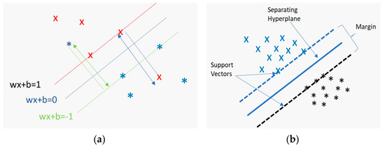where x is a vector data point, b is a constant term that indicates the distance from the origin, and w is a weight vector as shown in Figure 7 [46]. The data [a] should always be greater than zero in order to separate it. The SVM selects the best hyper-plane where the distance between separated data is as large as possible. The optimum hyper-plane yields the maximum margin between closest points.