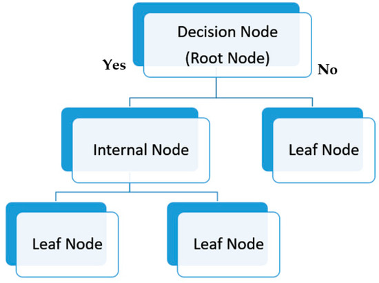 Decision trees are used by many machine-learning applications due its ability for classification and prediction tasks [47,48,49]. A decision tree is a supervised learning algorithm based on a hierarchical structure for recursive splits of nodes with smaller steps. It consists of decision nodes and terminal leaves where the decision nodes are connected together by a predictive model and each leaf represents a class. The decision tree model is illustrated in Figure 8.