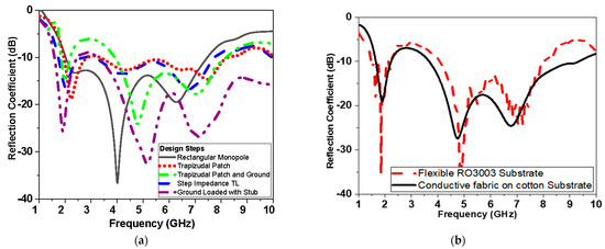 Simulated reflection coefficient in dB versus frequency: (a) different stages of monopole antenna design shown in Figure 1; (b) proposed monopole using flexible Roger 3003 and conductive textile fabric.