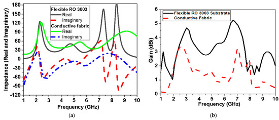 Simulation of proposed antenna-based sensor versus frequency using flexible Roger 3003 and conductive fabric: (a) real and imaginary part of impedance and (b) gain in dBi.