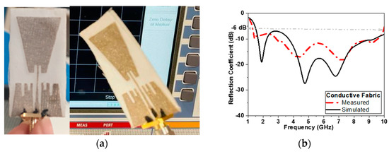 (a) Photo of fabricated antenna-based sensor using fabric conductor and (b) measured and simulated reflection coefficient in dB versus frequency.