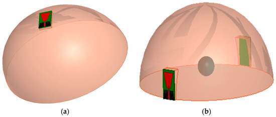 To study the effect of the proposed antenna sensor on the body and its detection capability, a breast model is fabricated. The model is composed of one layer equivalent to the three main breast tissue layers of interest (skin, fat, and glandular tissue) [24,25]. It is slightly less accurate compared to three-layer models but significantly reduces the computation time. Two simulation scenarios were conducted: The first scenario use one antenna sensor in proximity to the breast phantom as shown in Figure 14a. The second scenario uses two antennas at both breast sides as shown in Figure 14b.
