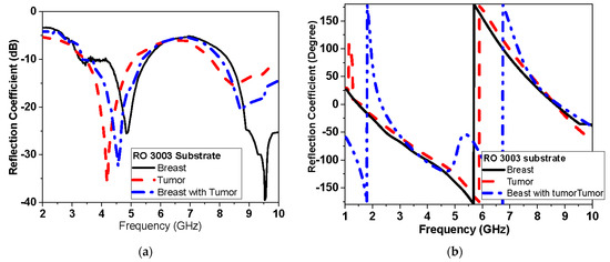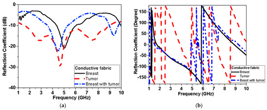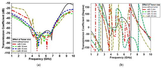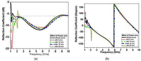 Simulated |S11| of proposed monopole textile antenna with and without tumor (second scenario shown in Figure 14b) at different sizes of tumor: (a) magnitude in dB and (b) phase in degrees.