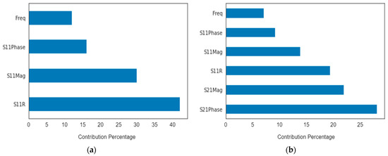 Feature importance illustrates the impact of training features regarding the prediction target, quantifying the effectiveness of the relevant features against the predicted decision. The table below shows each feature among the two conducted experiments and its exact percentage of contribution, introducing S11 parameters with magnitude and phase antenna along with the effect of the addition of S21 parameters. The figure below represents the importance of comparison of the data samples’ features. It verifies the strength of each data samples’ features.