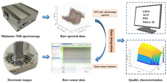 Obtaining objective, fast, and accurate information on the taste and quality characteristics of tea is the ideal method for the digital control of tea. Currently, the main rapid characterization methods widely used in the field of quantitative analysis and qualitative identification of tea taste quality are near-infrared (NIR) spectroscopy and electronic tongue (ET) sensing techniques. NIR spectra are vibrational spectra of molecular leaps of hydrogen-containing groups (bonds such as O—H, C—H, and S—H) in the non-visible region in the wavelength range 780–2526 nm [15]. The technique is more commonly used in the rapid testing of nutrient content and geographical traceability of tea [16]. In recent years, with the development of small and compact portable NIR devices, which minimize the size and manufacturing costs of equipment, the application scenarios of NIR have been expanded, showing good potential for development. The ET is a category of bionic sensing technology that utilizes a specific array of taste sensors to simulate the human tongue for signal perception and pattern recognition of liquid samples [17]. The technique employs suitable multivariate statistical analysis approaches for data processing of the obtained ET response signals to obtain the taste output results of the multi-sensor array, which objectively and rapidly reflects the taste characteristics of the samples and enables fingerprint identification and classification of the test samples [18]. The method has been studied and applied in wine [19], honey [20], tea [17], and other food industries [21]. Currently, most of the published studies evaluate tea quality with a single portable NIR technique or bionic sensing technology [22,23]. Few studies have fused micro-NIR spectroscopy and ET sensor data to more comprehensively characterize black tea quality and grade.